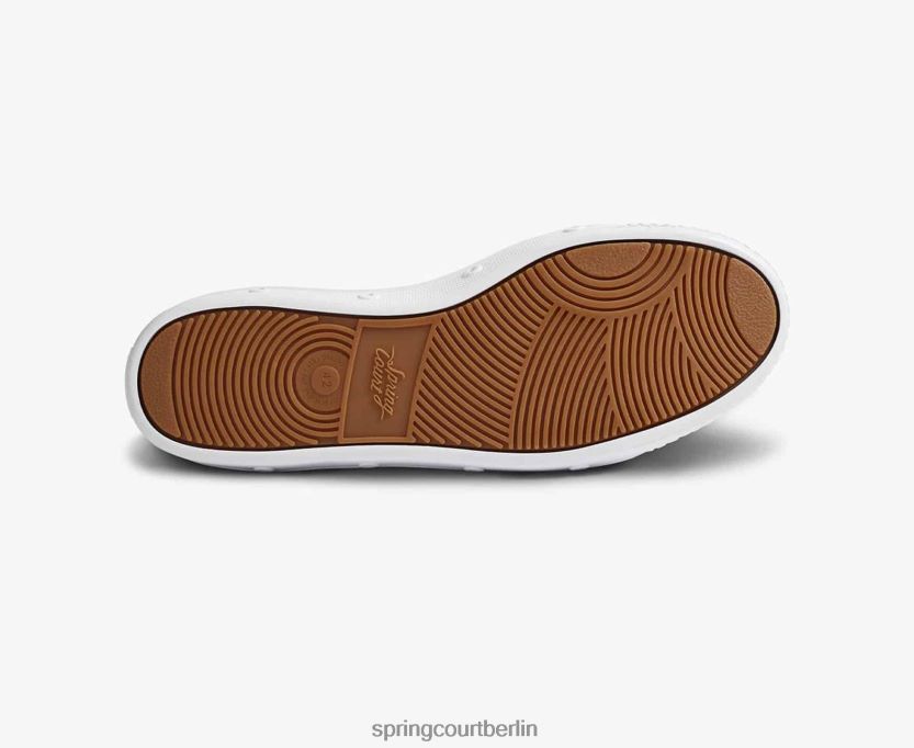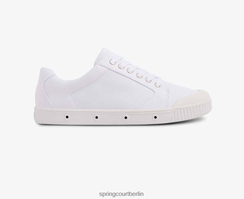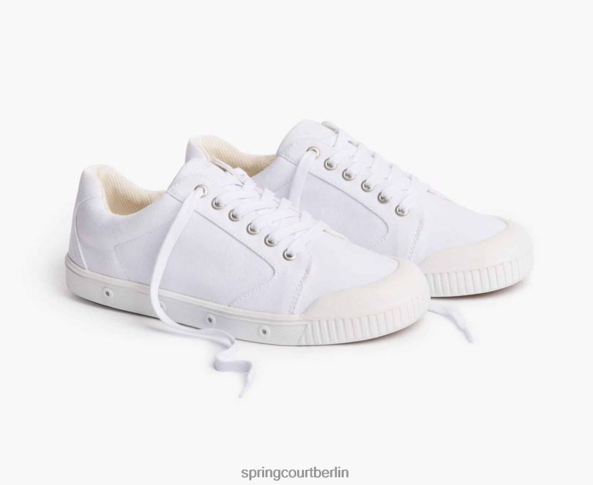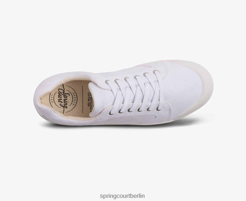 Der Schuh ist im charakteristischen monochromen Design der Marke mit traditionellem weißen Canvas-Stoff von Spring Court erhältlich.